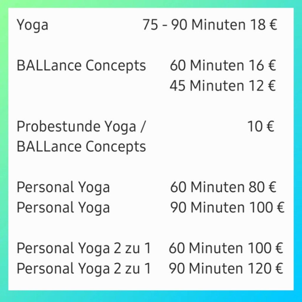 Preise 10 er Karten : Yoga / Pilates 180 € (6 Monate gültig) BALLance Concepts 160 € (6 Monate gültig)
